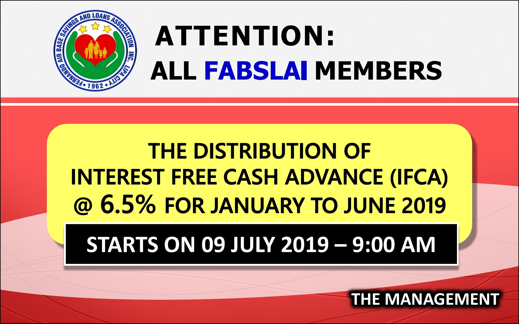 For the information of all FABSLAI members. Our Special Savings Deposit (SSD) will be closed effective December 2, 2019. Thank you and God bless....